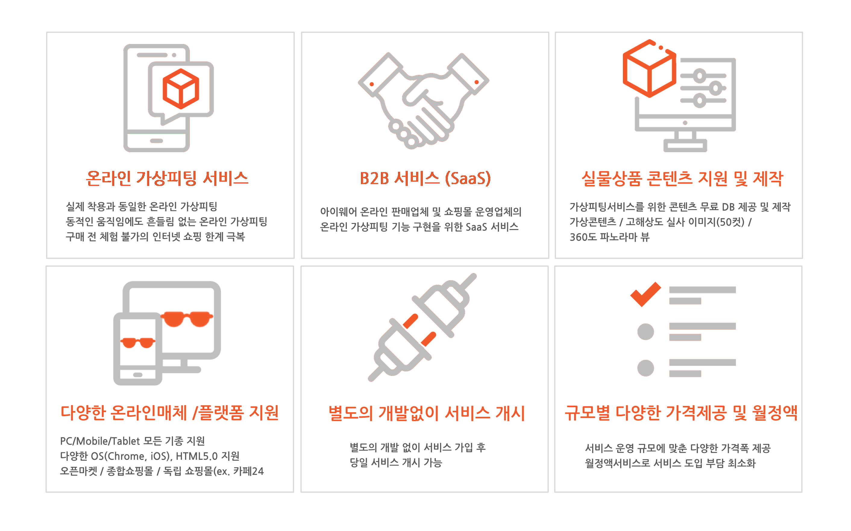 국내에 존재하는 모든 유형의 온라인 쇼핑몰에 서비스 지원이 가능합니다. 예를 들자면, 독립형 쇼핑몰, 오픈마켓(G마켓, 11번가, 네이버 쇼핑..), 종합 쇼핑몰(신세계몰, 롯데닷컴..), 쇼셜커머스(쿠팡, 티몬, 위메프)에 가상피팅 서비스 연결이 가능합니다.